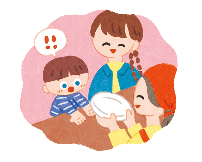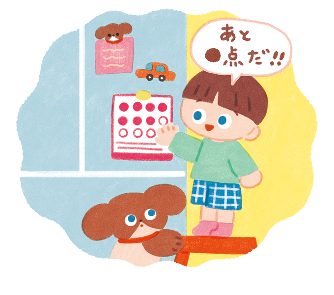 集めたシールを台紙にペタペタ。冷蔵庫などに貼った台紙がシールでうまっていく様子を見るのは、うれしいもの。「あと〇点!」と計算するのも楽しく、数の勉強の第一歩にもなります。