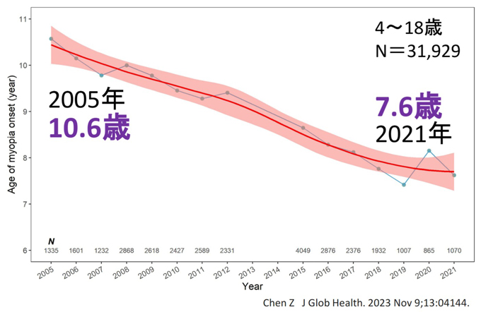 なかでも深刻なのが、近視発症の低年齢化。最新の研究では近視の発症平均年齢が2005年の10.6歳から、2021年には7.6歳まで低下。近視発症の年齢が低いほどその進行も速くなり、強度近視のリスクもアップ。強度近視は失明につながる可能性があると言います。