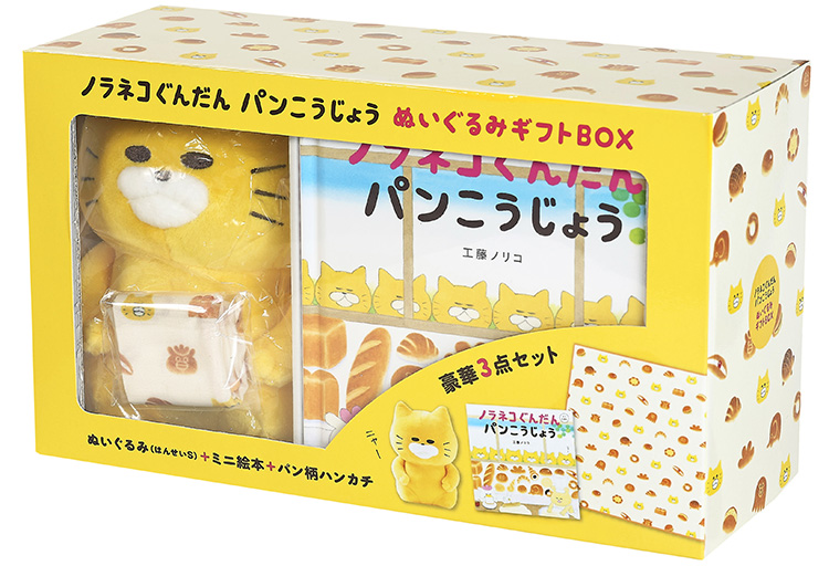①シリーズ第1作にして人気No.1の『ノラネコぐんだん パンこうじょう』のミニサイズの絵本 ②ロングセラーのはんせいポーズのぬいぐるみ(Sサイズ) ③絵本に登場するいろんなパンやノラネコの顔をちりばめた限定デザインの総柄ハンカチ(約20×20cm) の3つがセットに。クリスマスだけでなく通年贈れるギフトグッズとして、喜ばれること間違いなし!です。