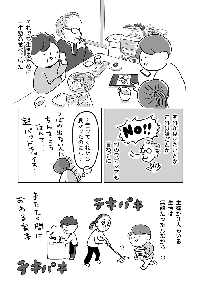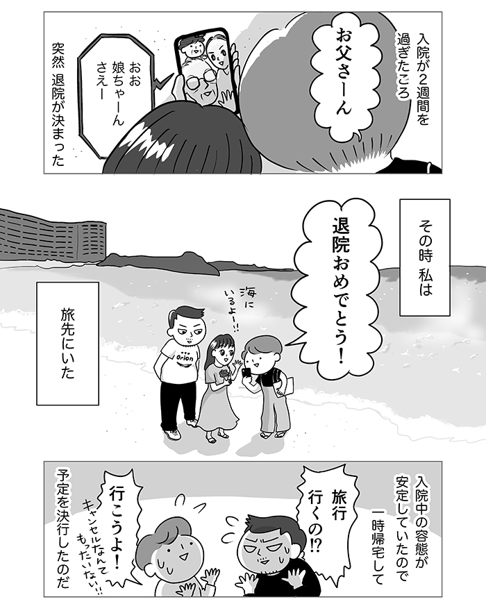 2025年4月30日 「また会えたね」父が再び退院。こんな日が、できるだけ長く続けばいいと思った【父の逝きざま~末期がんの父を自宅で看取るまで~・10】 こちらも読みたい【12月開催】ノラネコぐんだんPOP UP SHOPがペリエ千葉で期間限定オープン! 漫画家・うつみさえさんが、末期ガンになった父親を自宅で看取った、実話を元にした連載。第10話です。 前回までの話はこちらから 第10話 また会えたね 12次のページ こちらも読んで 【父の逝きざま】の一覧を見る 次回の話を読む 父の再入院。「万が一の時は、延命措置はいたしません」という言葉に、医師の信念を感じたのは…【父の逝きざま~末期がんの父を自宅で看取るまで~・11】 前回の話を読む 「俺の好きな曲よく知ってたな」病床の父のスマホにダウンロードした、懐かしい音楽たちのプレイリスト【父の逝きざま~末期がんの父を自宅で看取るまで~・9】 最新話を読む 本人の意思を無視した形で行った、父の葬儀。そこで知った父の姿。自宅に戻って、気づいたことは…【父の逝きざま~末期がんの父を自宅で看取るまで~・最終話】 この連載を最初から読む こちらも読みたいロールパンにビスケット生地をかぶせて焼くだけ! おうちで「簡単メロンパン」の作り方【こどもおやつ】 キーワード:うつみさえ父の逝きざま看取り NEXTPREV