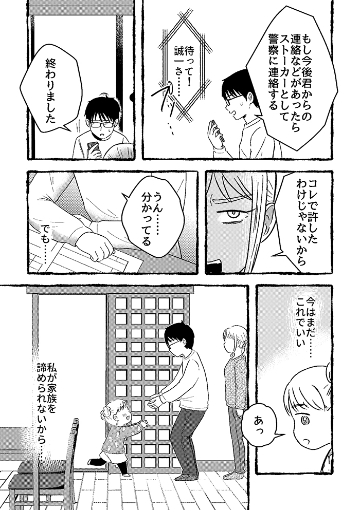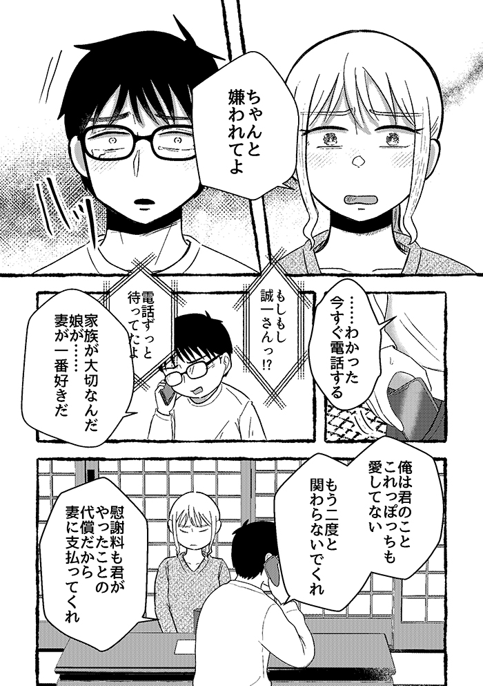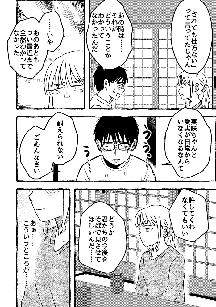 2025年10月23日 「ちゃんと嫌われてよ」目の前で不倫相手に電話をかけさせた。許したわけじゃないけど、不倫の果ての我が家は…【不倫の果ての我が家・最終回】 こちらも読みたい豆原一成さん(JO1)インタビュー「おばあちゃんっ子なんです。おばあちゃんから連絡がくると幸せな気持ちになります」 第5回マママンガ賞で栄えあるストーリー大賞を受賞した、魚田コットンさんによる連載。幸せに見えた夫婦が抱える闇、そして家族を守るために選んだ選択とは……。 20話 12次のページ こちらも読んで 【不倫の果ての我が家】の一覧を見る 前回の話を読む 不倫相手からも家族からも嫌われたくないんでしょ?そんな人をどうやって信用したらわからない。だから…【不倫の果ての我が家・19】 この連載を最初から読む こちらも読みたい「パンダやライオンはなぜ、むし歯にならないの?」新刊絵本『1回3分 むし歯にならない絵本』が発売されました。【メイキング&筆記インタビュー】 キーワード:不倫再構築夫婦 PREV