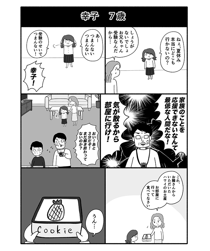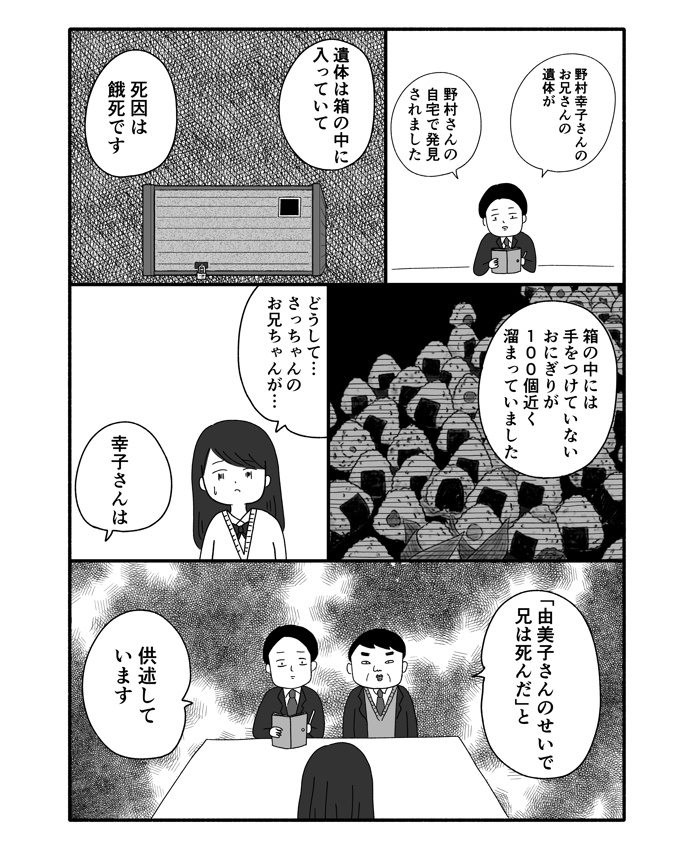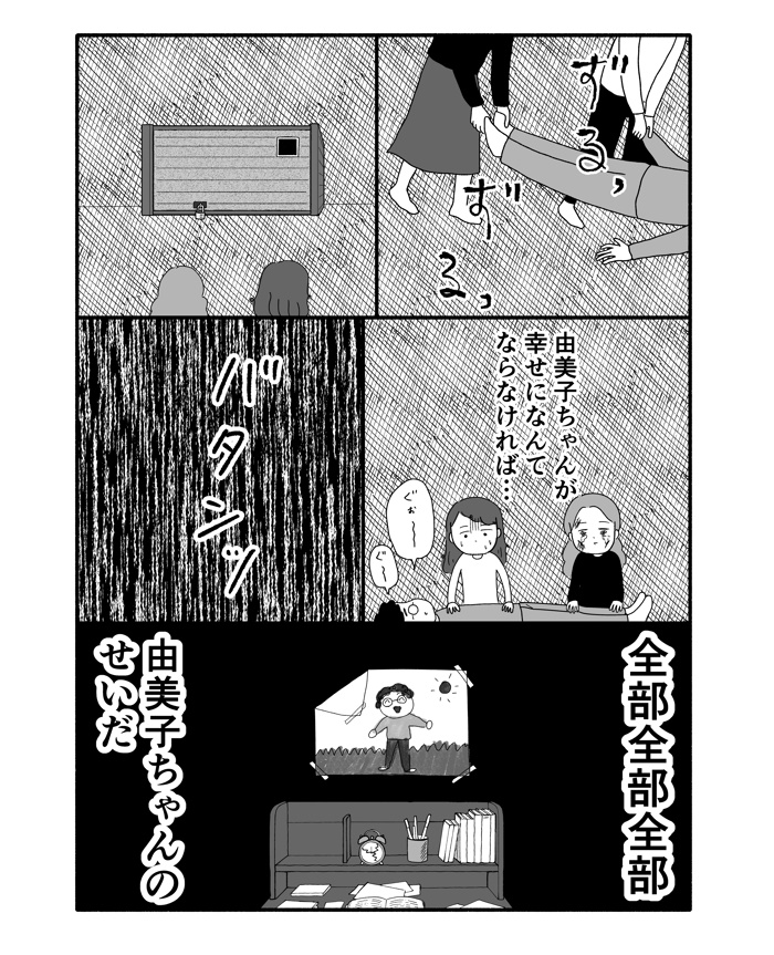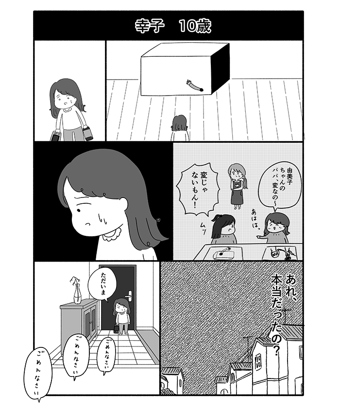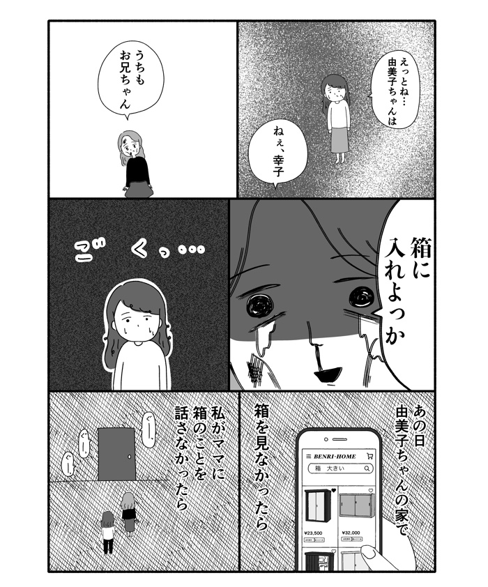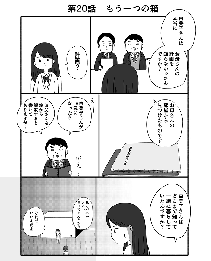 2025年12月12日 「『由美子さんのせいで兄は死んだ』と供述しています」。もう一つの「箱」のストーリー【箱の男・20】 こちらも読みたいタレント・辻希美さんインタビュー「反抗期でも『3食だけは絶対作って食べさせる』と決めています」 漫画家・都会さんの連載第19話。ある家庭の18年間を描いたストーリー。 これまでの話はこちらから 第20話 都会 漫画家。奇妙なもの、面白いもの、かわいいものに目がない。 著書に『憂鬱どうぶつ(株)』(秋田書店)、『3匹の大人ぶた』(KADOKAWA)、『会社がツライ』(マガジンハウス)他。 X(旧Twitter): @okameid こちらも読んで 【箱の男】の一覧を見る 前回の話を読む 「私が…やりました」「私が15年間、彼を閉じ込めました」。ついに箱が開いて、中から出てきたのは…【箱の男・19】 この連載を最初から読む こちらも読みたい「パンダやライオンはなぜ、むし歯にならないの?」新刊絵本『1回3分 むし歯にならない絵本』が発売されました。【メイキング&筆記インタビュー】 キーワード:都会 PREV