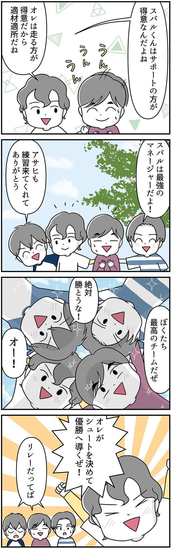 リレーで走るのは苦手なスバルですが、自分のできることで頼りにされたのが嬉しくて、一生懸命マネージャー業を頑張りました。