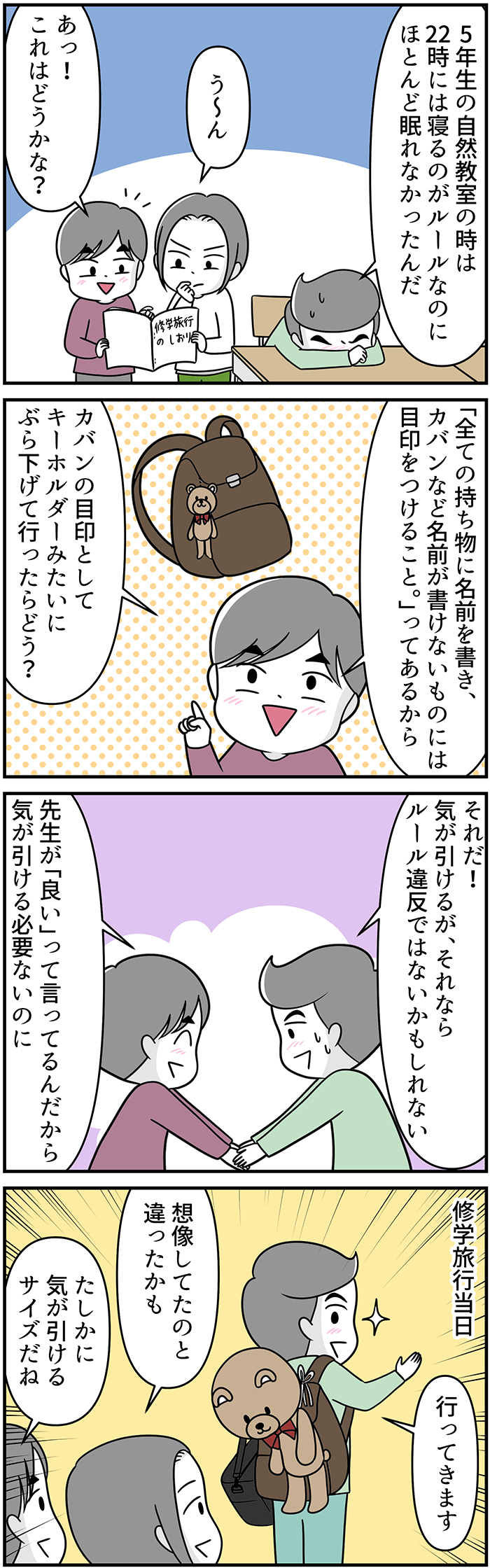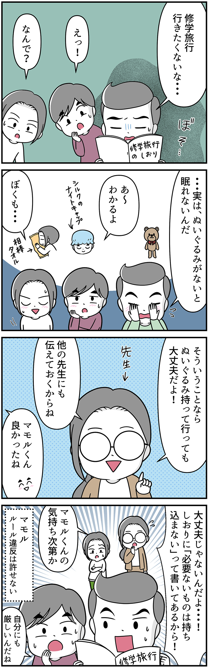 修学旅行先に行きたくない理由は、ぬいぐるみがないと眠れないから。ルールを破りたくないマモルくんが納得できる秘策とは…【自閉症BOY★スバルくん・129】