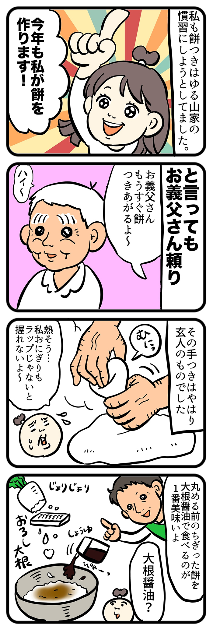 夫のチゲさんとは28歳差という、超年の差婚のまげよさんは、結婚して義父、マキオさんと同居しました。一般的に「同居」というと、同情や共感の声があがりますが、まげよさんの場合は……。今回はまげよさんの、餅つき機とマキオさんの思い出、第2話です。
