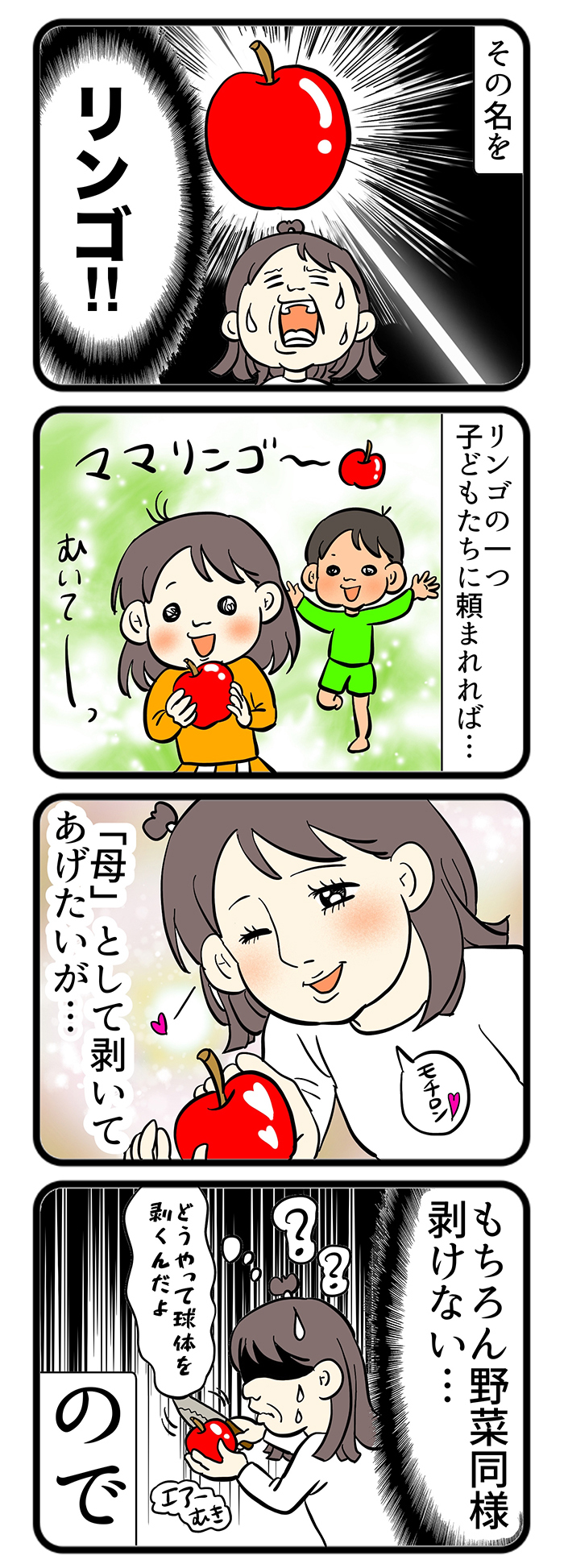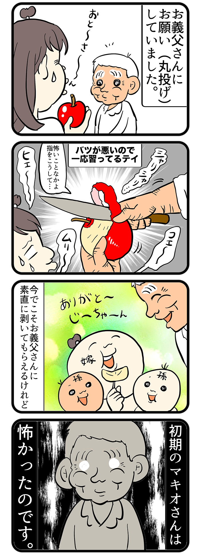 包丁使いが超苦手なので、りんごを向くのは義父・マキオさんに丸投げ。そのことで過去には…【しぶしぶ同居したら義父が最高だった件・95】