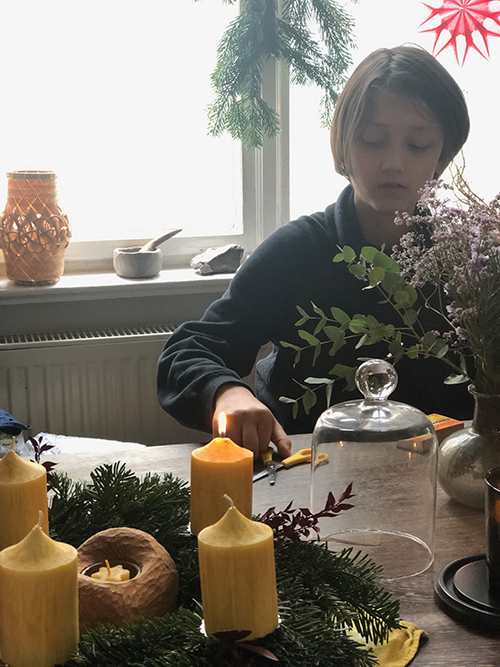 アドヴェントクランツと呼ばれる蝋燭付きリースも毎年手作り。毎週日曜ごとに蝋燭を灯してクリスマスを待ちます。静かないい時間。それがドイツのクリスマス。