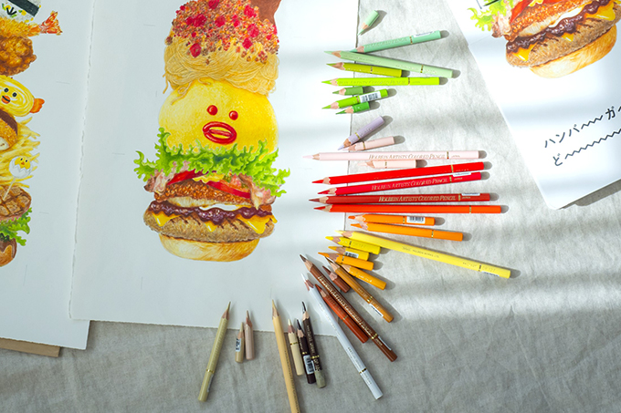 撮影用に持参してくれた、最新刊『どーーーぞ!』(白泉社)の原画と、愛用のホルベイン『アーチスト色鉛筆150色』の一部。深みのある色や質感を表現するのに欠かせないそう。